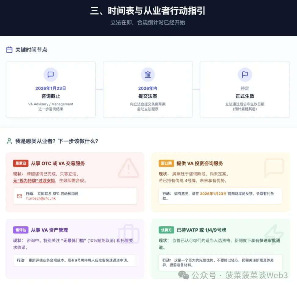 这是从业者最关心的问题之一。SFC 明确表示:不会提供「deemed licensed」过渡安排。新制度生效之日,所有未持牌的 VA 交易服务提供者必须立即停止相关业务。