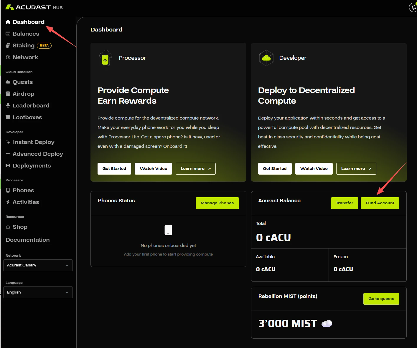 STEP 3. 完成基础任务后,点击“Dashboard”后选择“Fund Account”后领取测试币。