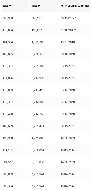 关于 “*” 的注解: 这些区块已经在 2012 年和 2017 年挖出,它们的 coinbase 交易并没有重合。209921 区块(第一次增发量减半的倒数第 79 个区块)不可能重合,因为那时候还实行 BIP30 检查。