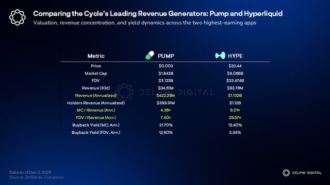 按今天的数据计算,Pump的年化收入为4.22亿美元,市值为18.4亿美元,这意味着市盈率为4.36倍,年化回购收益率约为12.8%,这些水平远低于其他所有市值较大的代币,包括Hyperliquid的市盈率约为8.01倍,年化收益率约为3.34%。