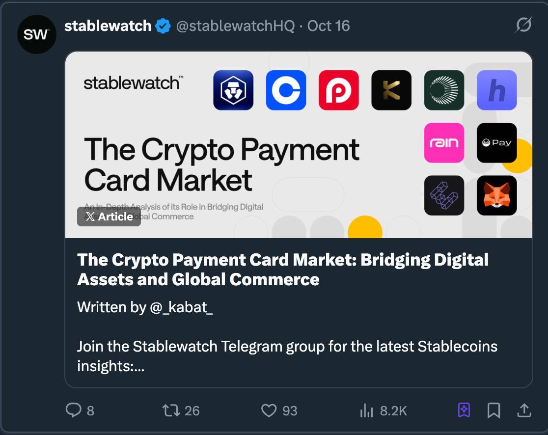 stablewatchHQ对这种桥接机制进行了深入分析,将其本质上定义为一种“卡片即服务”(Card-as-a-Service,CaaS)模式。这是许多人讨论加密卡片时最容易忽视的一个关键点。这些CaaS平台提供了发行自有品牌卡片的基础设施。