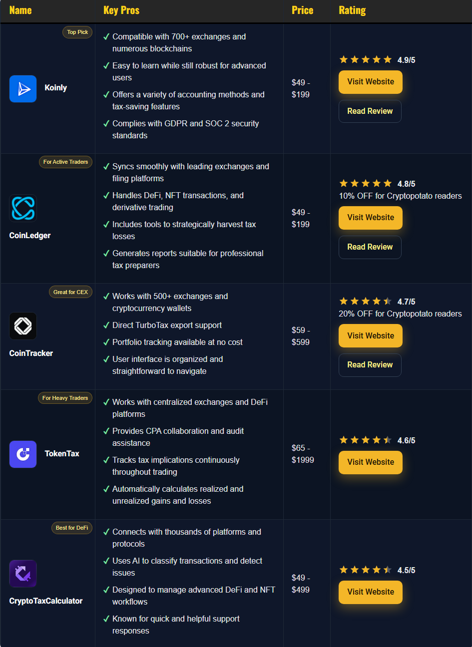 也就是说,以下是市面上一些最好的加密货币税务软件,我们对它们的全部功能、定价方案以及您需要的所有信息进行了全面比较。