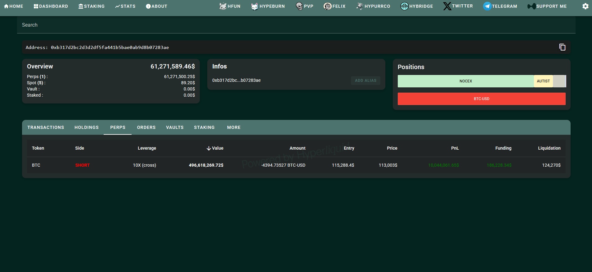 根据Hyperliquid区块浏览器Hypurrscan的数据,该鲸鱼现在持有价值约4.96亿美元的空头头寸,使用10倍杠杆,比特币清算价格为124270美元。