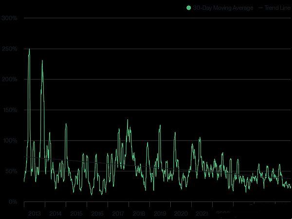 比特币的情况同样如此。随着比特币从早期适用者转向机构投资者,且作为一项技术逐渐成熟,它已不再像十年前那样面临生存层面的风险,作为资产类别的成熟度显著提升。这一点从比特币的波动率中可清晰看出——自2024年1月比特币ETF开始交易以来,其波动率已大幅下降。