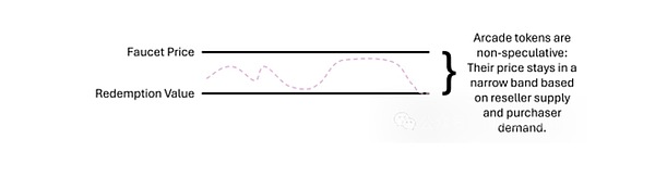 街机代币通常以预先设定的价格自由购买。想想海滨长廊街机厅里的代币自动售货机:你走过去投币一美元,机器就会给你四个代币,每个代币的价格是25美分。这种代币自动售货机,通常被称为“水龙头”或“阀门”,实际上设定了一个价格上限,市场价值永远不应超过这个上限。因此,街机代币不具备投资价值:它们是用来消费的,而不是用来投机的。