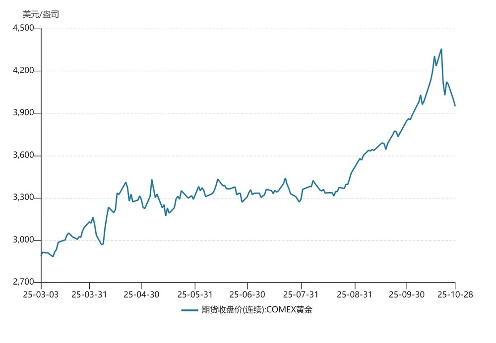 今年黄金涨势凌厉,仅用了七个月,国际金价便从3000美元/盎司飙至4000美元/盎司。10月20日,COMEX黄金刷出4398美元/盎司的历史峰值后,次日晚间即重挫5.07%,创上市以来单日最大跌幅;随后颓势延续,至10月29日已跌破4000美元/盎司关口,8个交易日内回撤近10%。