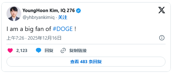 金英勋(YoungHoon Kim)博士,因自称拥有全球最高IQ(276)而在网络上广为人知。近期,他在X平台公开发帖表达了对狗狗币的喜爱,再次引发讨论。
