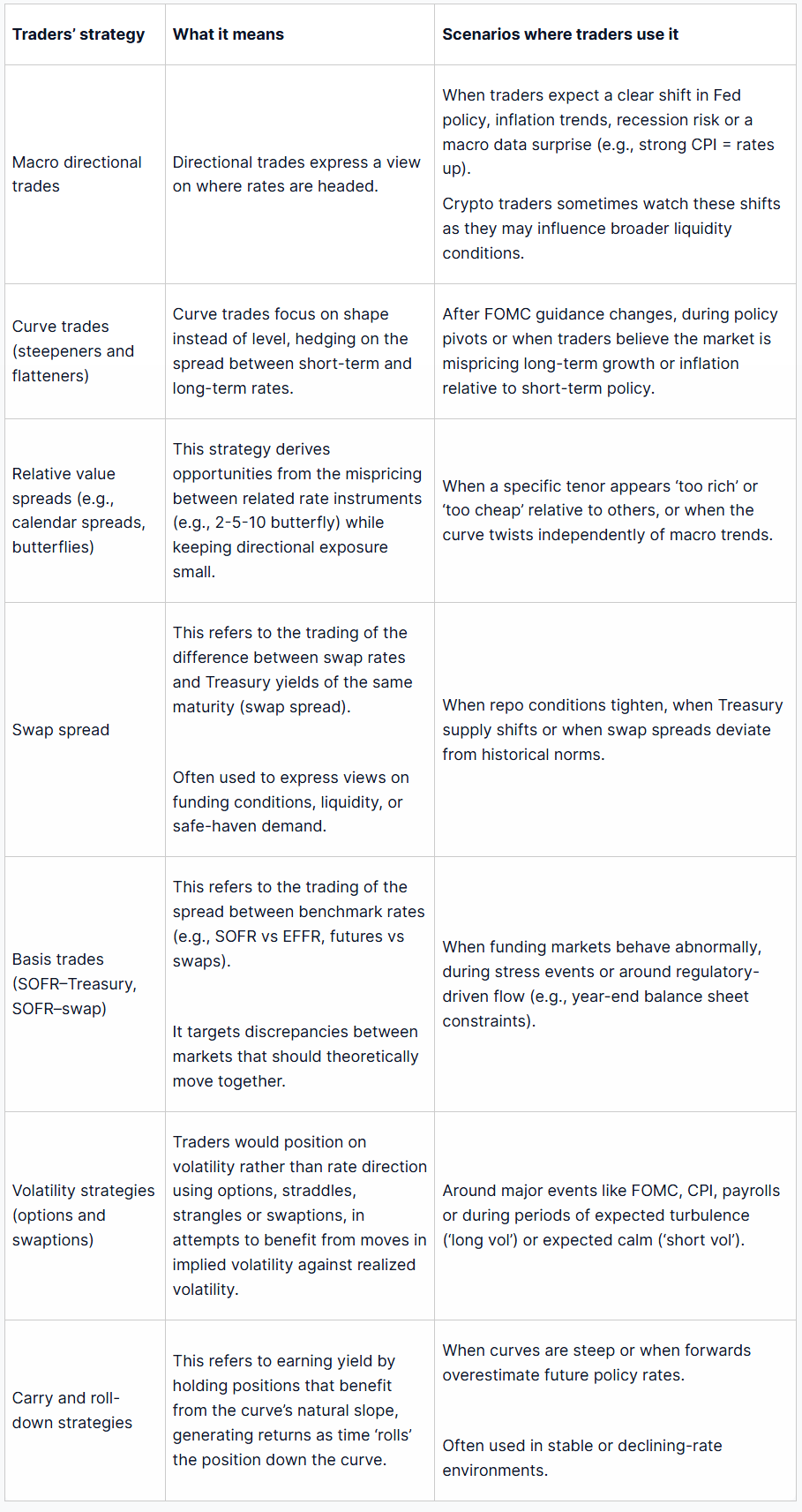 不。债券交易涉及信用风险、流动性风险、票息行为以及特定发行人的风险。利率交易则侧重于使用衍生品来隔离利率风险敞口,从而追踪基准利率(如 SOFR、EFFR 和国债收益率)的走势。