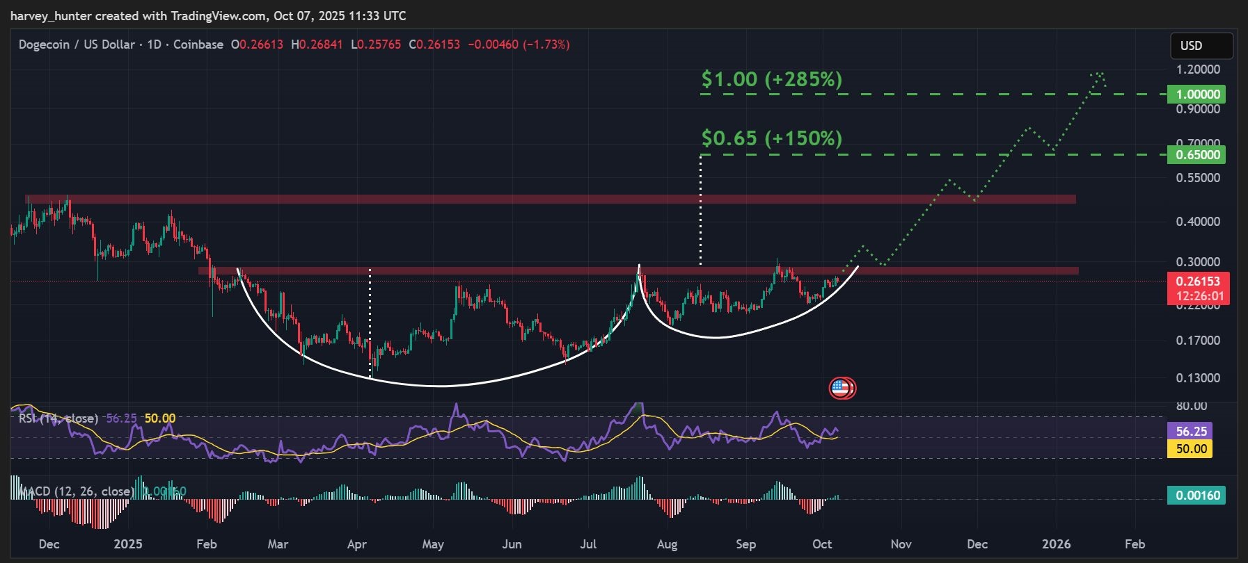 随着牛市成熟,持续降息以及通过ETF、企业金库甚至潜在401(k)纳入的更深入TradFi曝光,可能进一步推动DOGE上涨。1美元里程碑可能进入焦点,实现285%涨幅。