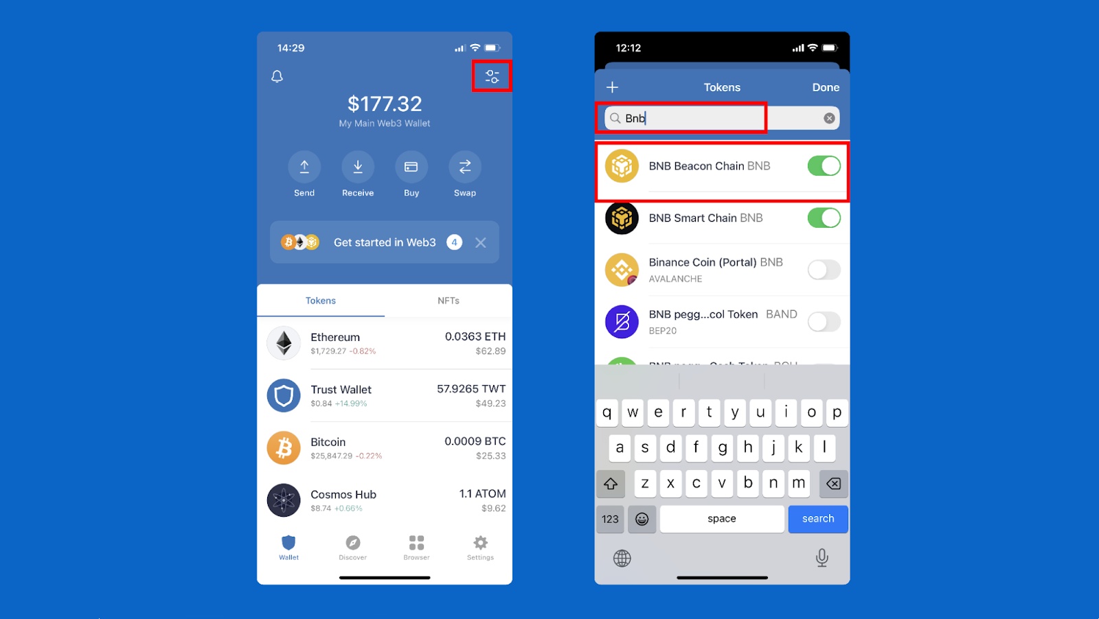 通过钱包主页面导航到 BNB 资产,或者如果您在那里找不到它,您可以选择右上角的切换图标,然后搜索它。选择“BNB Beacon Chain”。