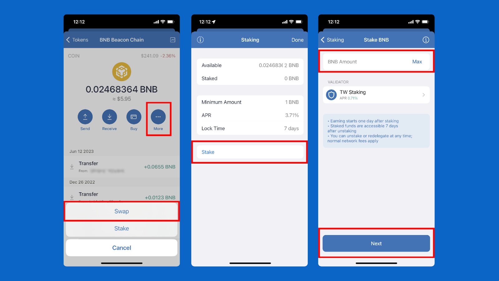 选择“更多”按钮,然后选择“兑换”。在质押页面,选择“质押”。选择您想要质押的金额,选择“下一步”,然后按照其余说明质押您的 BNB。