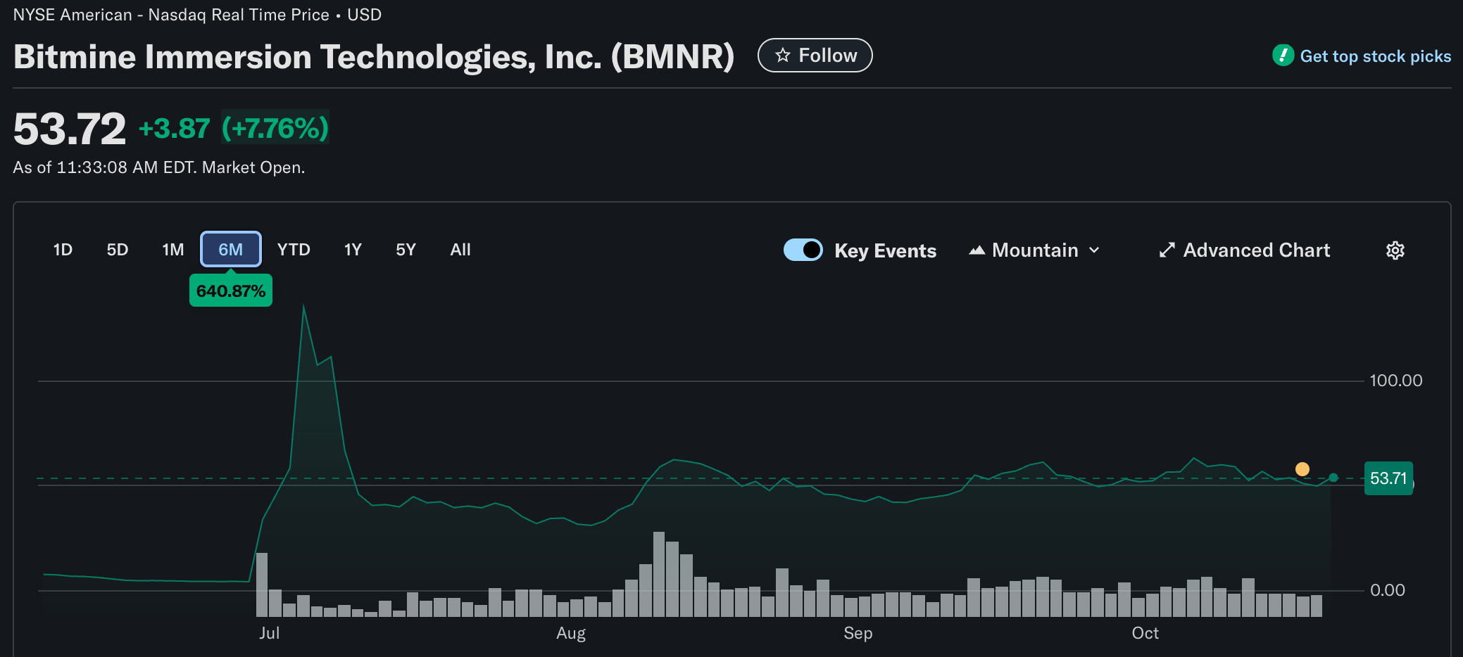 今日公告发布后,这家在纽约证券交易所上市的公司的股票 BMNR 飙升 7.76%,截至本文撰写时交易价为 53.72 美元。过去六个月,该股上涨了惊人的 640.87%。