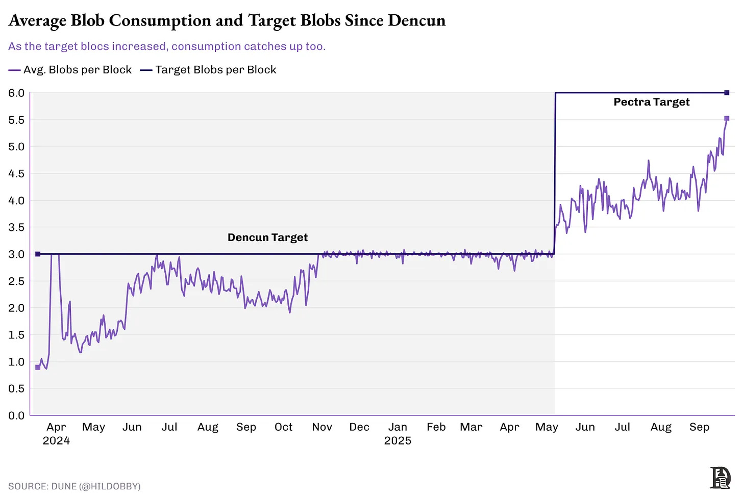 随后推出了Pectra。这次升级增加了每个区块中的数据块数量。第一步是为汇总数据创建一个单独的空间,第二步是增加其容量。Pectra将目标提升至每个区块六个数据块。