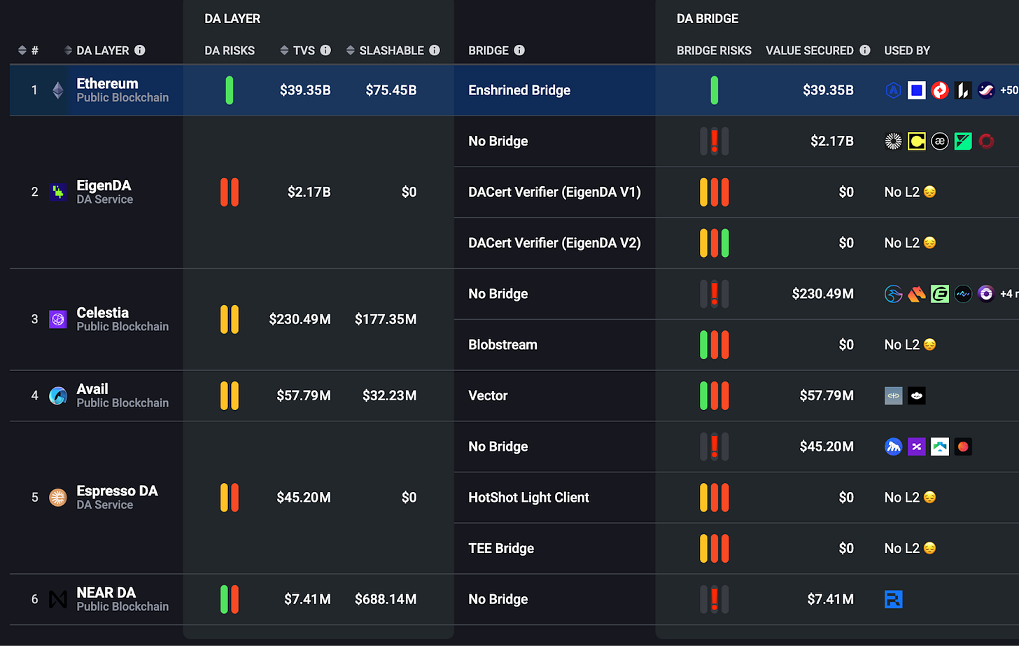 虽然多轮汇总的设想得以实现,但以太坊占据了这一市场。这些升级为以太坊链提供了超过55个汇总的DA解决方案,并确保了超过400亿美元的总锁定价值(TVL),从而使以太坊链受益匪浅。