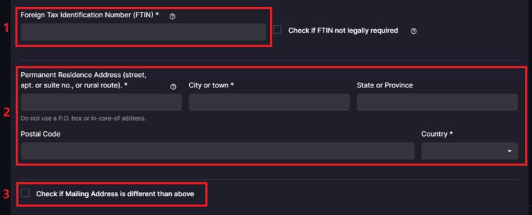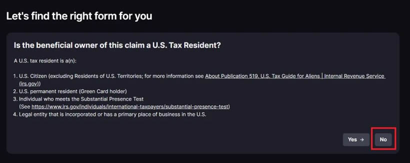 如果您是美国的税 务居民,请点击「是(Yes)」,并填写W-9 表格。您不是美国税 务居民,请按一下「否(No)」。然后平台将引导您填写W-8。