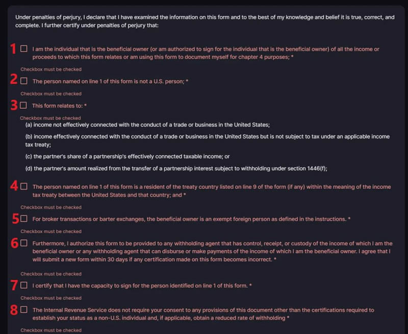 完成填写后,您将收到一份预先填写的W-8BEN 表格,其中包含您刚刚提供的资讯。要验证它,您必须选取所有标记为红色的方块。