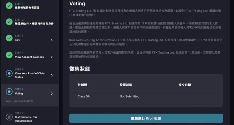 持有FTT 以外的法币或加密货币的用户将有权投票,如果您有投票权,可按照以下步骤进行投票:点击「继续进行Kroll 投票」>「Click here to submit your ballot for this Plan Class」>勾选您决定的选项,选项包括: