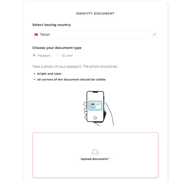 该过程需要上传您的身份证明文件(护照或身份证)和3 个月内的地址证明文件(银行对帐单或水电费帐单等),因此可提前准备好。