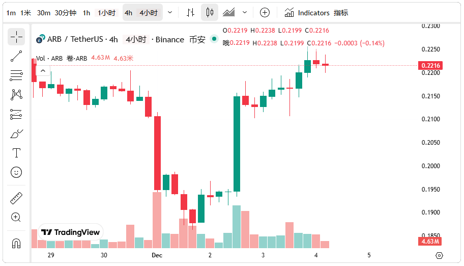 ARB(ARB)在过去24小时内,Arbitrum的价格飙升超过11%,超过了加密货币市场整体7%的反弹幅度,这主要得益于Arbitrum网络活动的加速以及图表上可能出现的双底形态。