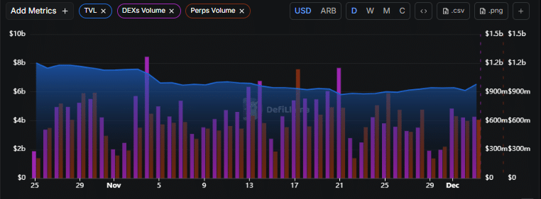 根据DefiLlama的数据,Arbitrum的总锁定价值(TVL)维持在12月初的稳定水平,但月度涨幅达7%,达到约65.3亿美元。永续期货交易量和去中心化交易所的交易活跃度分别保持在6.39亿美元和6.07亿美元,表明在近期价格上涨的背景下,市场依然保持韧性。11月份,这些指标出现间歇性激增,凸显了网络上周期性的交易活跃度。
