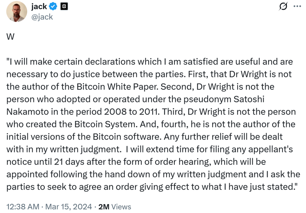 此案最终于2024年3月以高等法院的判决告终,判决结果对他们有利。判决宣布后,多尔西只是简单地谦逊地称之为“胜利”。