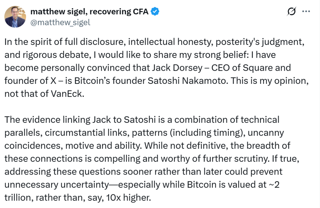 那么,是什么让一些聪明且受人尊敬的人——包括VanEck的数字资产研究主管Matthew Sigel——如此确信Dorsey是比特币的创造者呢?