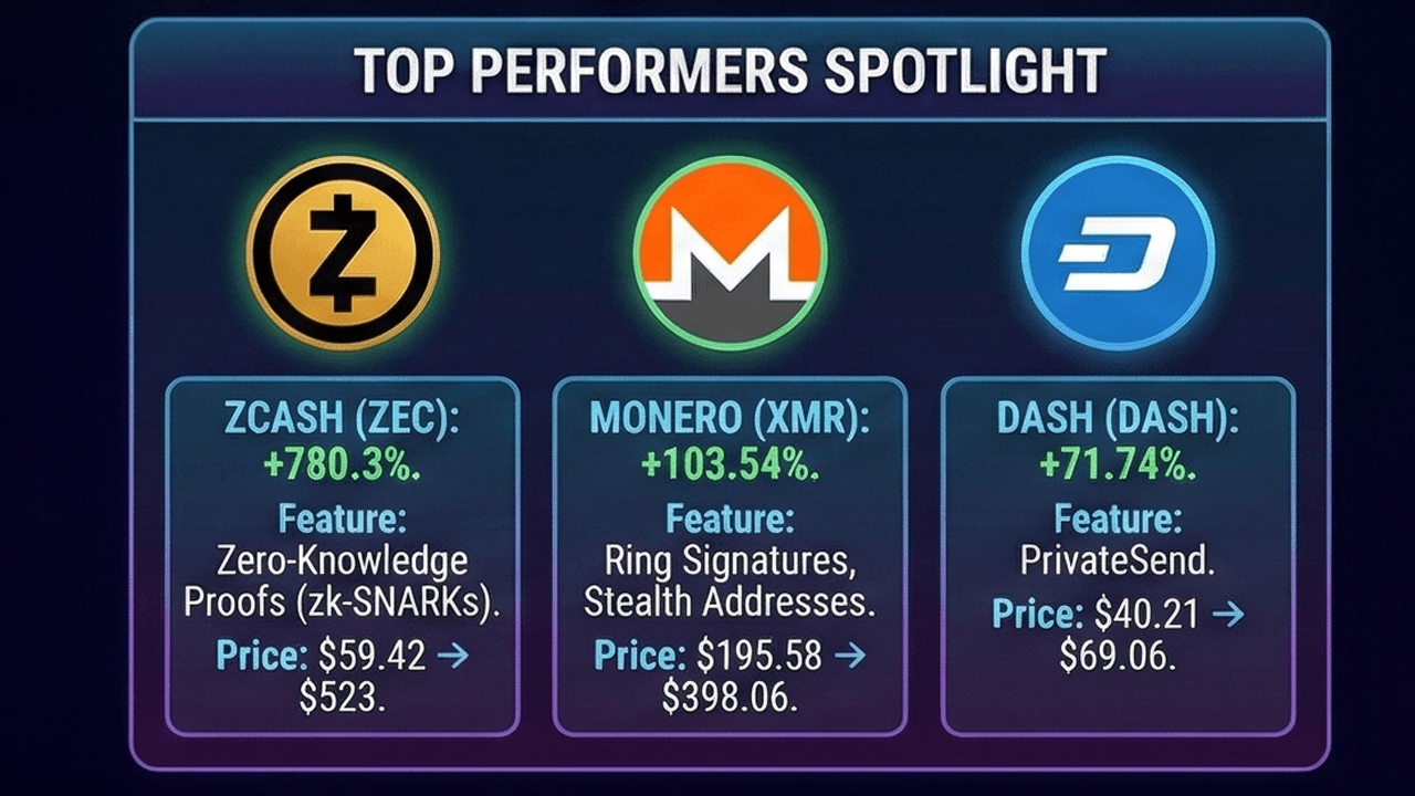 Zcash(ZEC)以超过780%的涨幅领跑该领域。