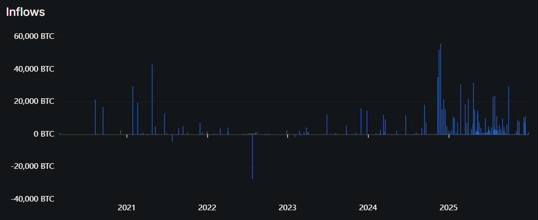 图3:比特币资金流入和流出趋势(2021-2025年)