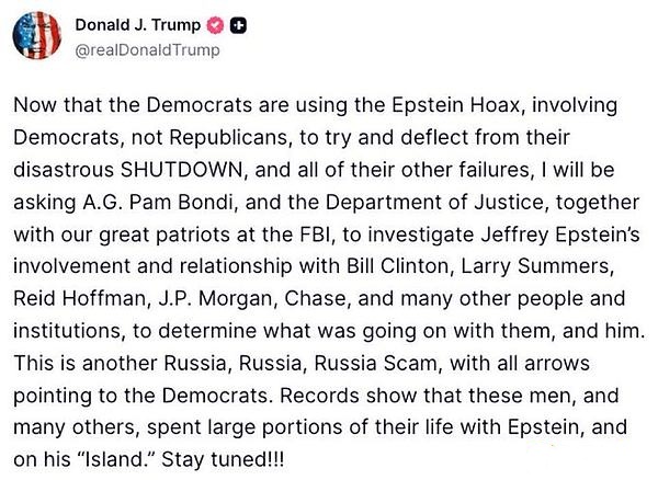 所以,当特朗普发布关于爱泼斯坦关系网的内容,并明确点名摩根大通(而不是孤立地看待个人)时,这并非修辞上的夸张。他将体制内根深蒂固的机构拉进了这场舆论风暴。