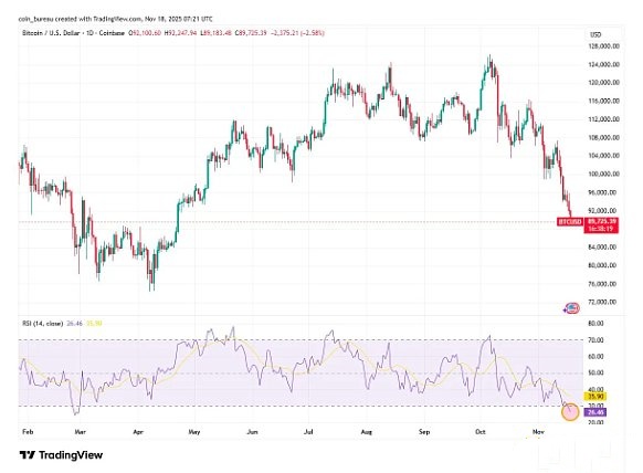 Coin Bureau数据显示,“比特币日线RSI指标已跌至26,为2月份以来的最低水平,表明比特币已进入超卖区域。”