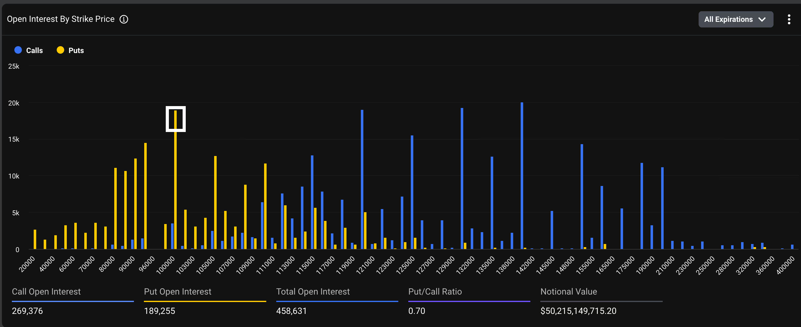 Deribit 上的比特币期权未平仓合约刚刚创下 500 亿美元的历史新高,其中 10 万美元的看跌期权越来越受欢迎。