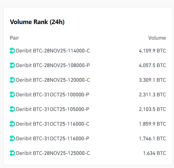 与此同时,Deribit(Coinbase 旗下衍生品交易所)周四披露,其平台期权 OI 同样刷新纪录,达到约 500 亿美元。值得一提的是,行权价 10 万美元的看跌期权交易热度上行。