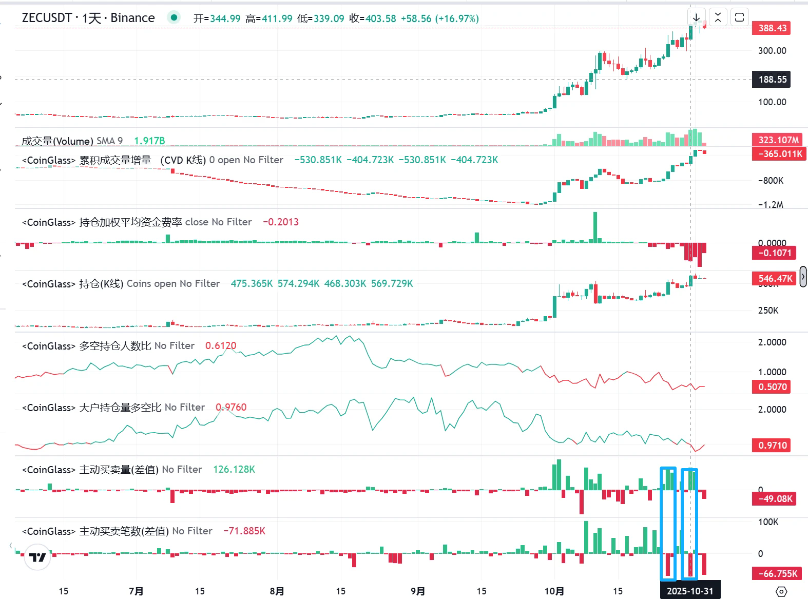 在 ZEC 的合约数据表现中,我们可以明显的看到自 10 月起,资金流入量>资金流出,这在一定程度上表示,还有大量合约仍然停留在市场内。而在 10 月 26 日和 10 月 31 日,主动买卖量(差值 )和主动买卖笔数(差值)这两个数据更是出现了明显的背离,卖出频率增加,但是资金流入量却明显增大,在这种情况下,我们是否可以将其理解为“散户离场、庄家进场”的行为信号。当然,ZEC 价格的上涨已经给出了最好的证明。