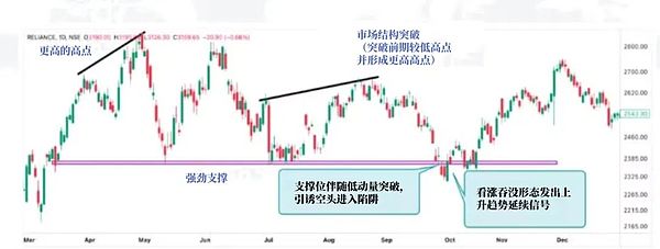 ● 回踩确认支撑有效:价格反转后若能回踩并站稳于原支撑位(现已转为阻力位)上方,可确认是陷阱而非有效破位。