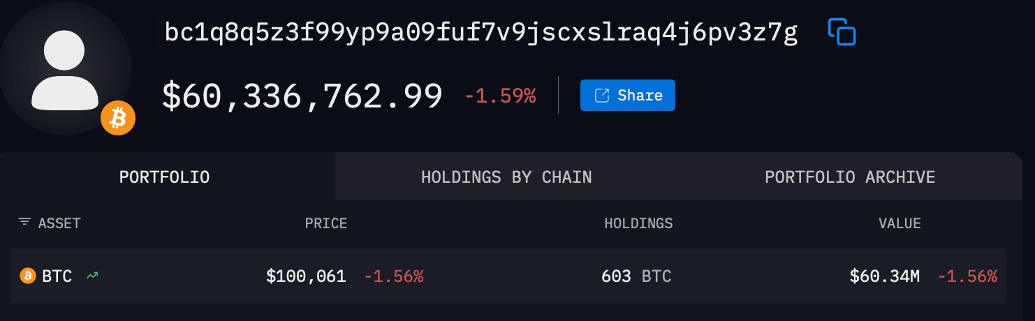 该钱包转移了603枚比特币,价值刚刚超过6000万美元。