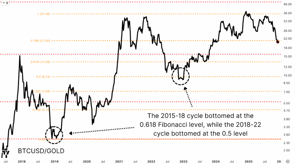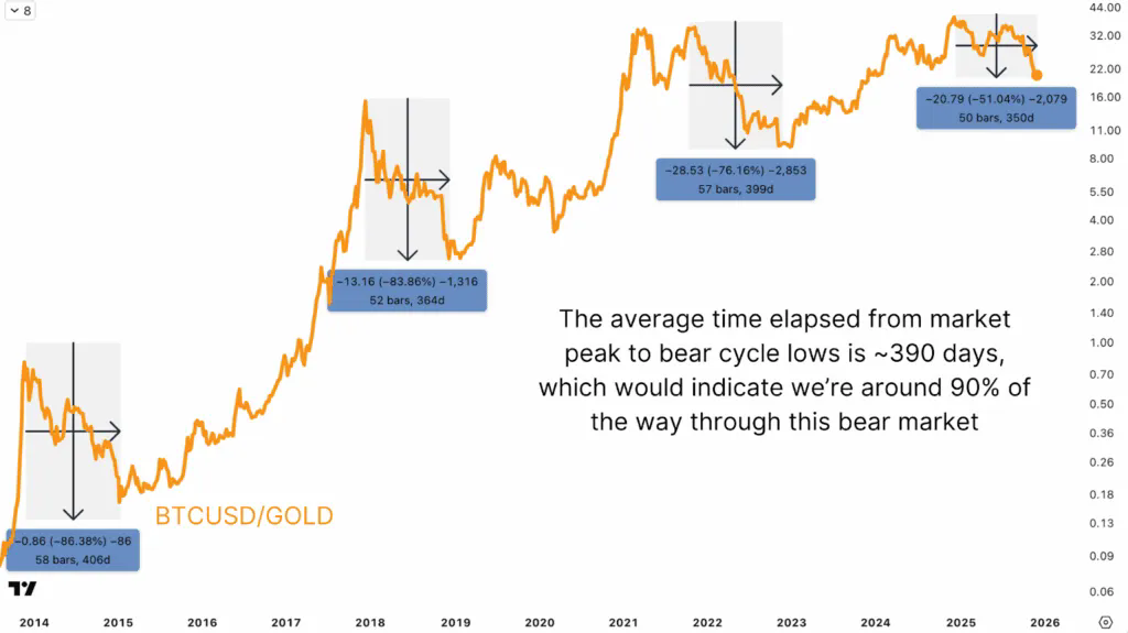 比特币兑黄金的走势图与美元走势图呈现出截然不同的景象。比特币在2024年12月达到峰值,此后已从该水平下跌超过50%,而美元估值在2025年10月达到峰值,远低于前一年创下的高点。这种背离表明,比特币的熊市持续时间可能比大多数观察人士意识到的要长得多。回顾以黄金为基准的历史比特币熊市周期,我们可以发现一些模式,表明当前的回调可能已经接近关键支撑区域。
