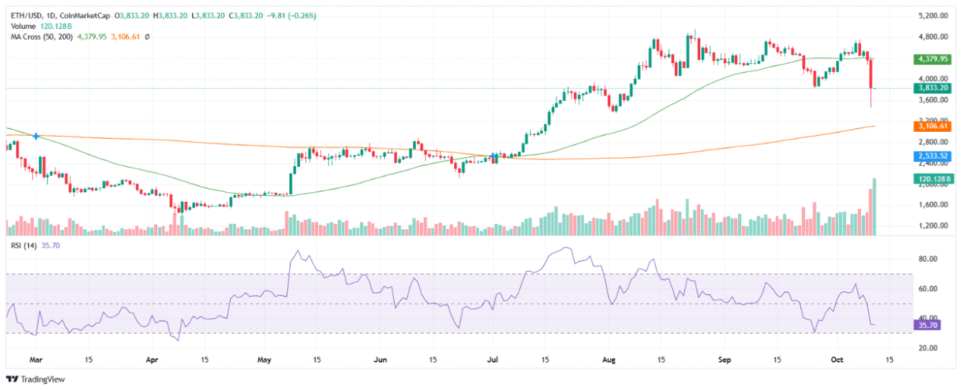 尽管加密货币在4700美元遭遇阻力后过去几天下跌14%,但以太坊当前的技术结构仍增强了投资者的乐观情绪。值得注意的是,三日图表上出现了50日均线向上穿越200日均线的金叉形态,这历史上往往预示着强劲上涨趋势的开始。