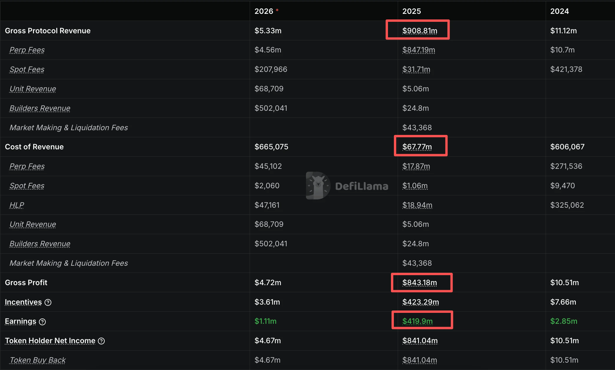 据DefiLlama数据,Hyperliquid 2025年收入为9.08亿美元;营收成本约为6777万美元,年度净利润约为8.43亿美元,剔除激励型支出,2025年收归平台的净利润高达约4.2亿美元。