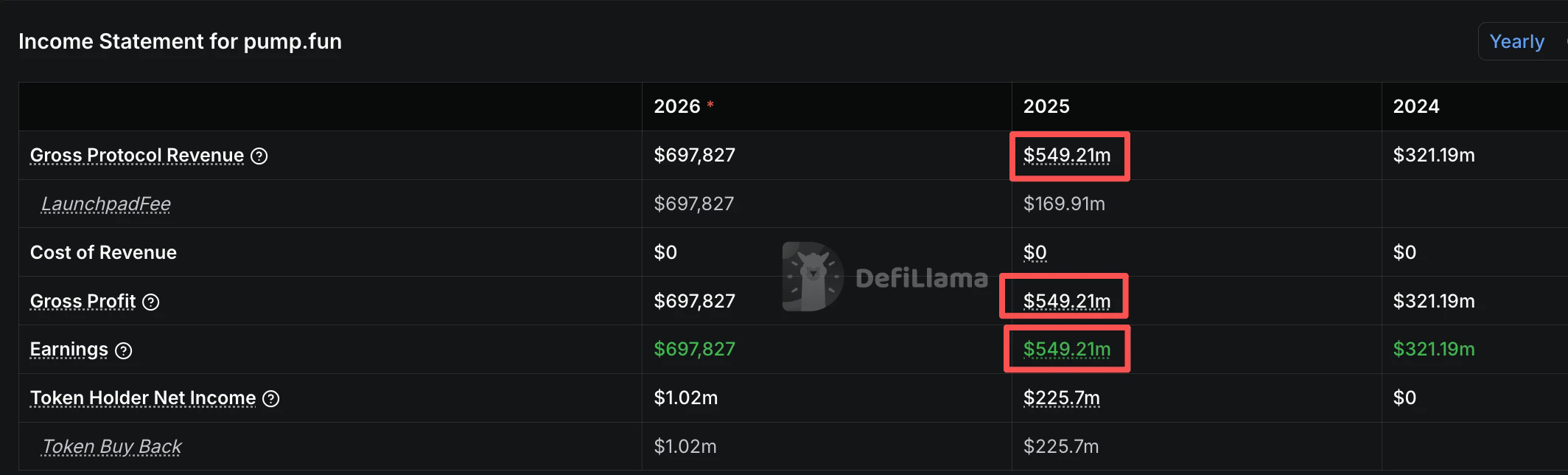 据DefiLlama数据,Pump.fun 2025年度收入约为5.5亿美元,和Hyperliquid等链上perp DEX平台不同的是,作为一个“一键发币平台”,Pump.fun无需支出激励费用,因而其平台年度净利润约等于年度收入,即5.49亿美元。