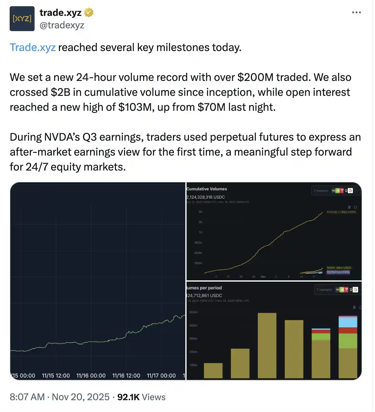 美股永续合约的PMF已经得到初步验证。数据显示,trade.xyz的累计交易量已突破20亿美元,NVDA财报发布期间更是创下了单日2亿美元的交易记录,过去24小时交易量约为7.34亿美元。