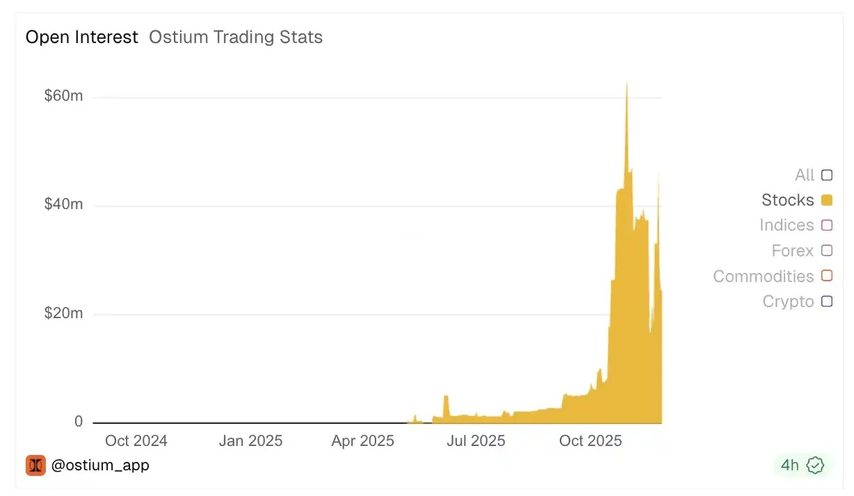 根据Dune上的Ostium关于美股合约交易的数据统计,目前单日美股合约交易量已经突破5000万美元。美股合约交易的OI(未平仓量)曲线则在今年10月达到了历史峰值,约6400万美元,而现在回落到4500万美元左右。在OI上也能看出Ostium的美股合约未平仓量占比总未平仓量的20%。