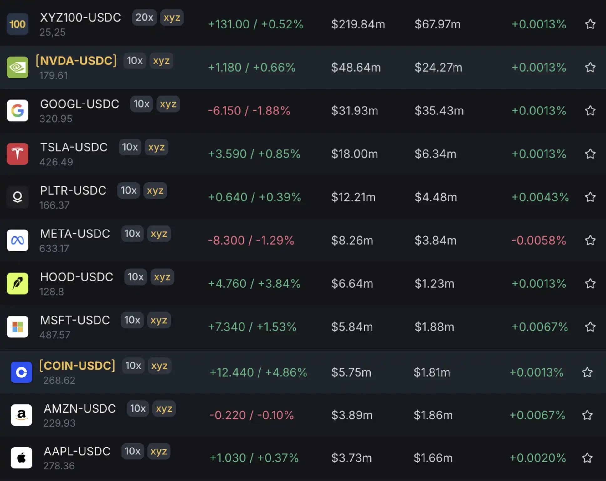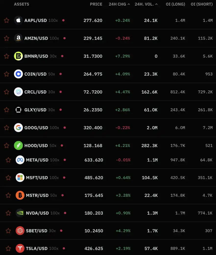 包括加密行业里各大Perp DEX像是Hyperliquid、Trade.xyz、Ostium、Lighter都已经上线了美股的永续合约交易。