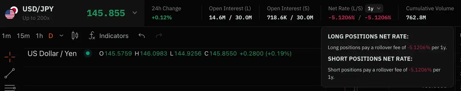 展期费会显示在净利率(L/S)标签上。将鼠标悬停在上面,会显示一个说明长短转期费用的工具提示