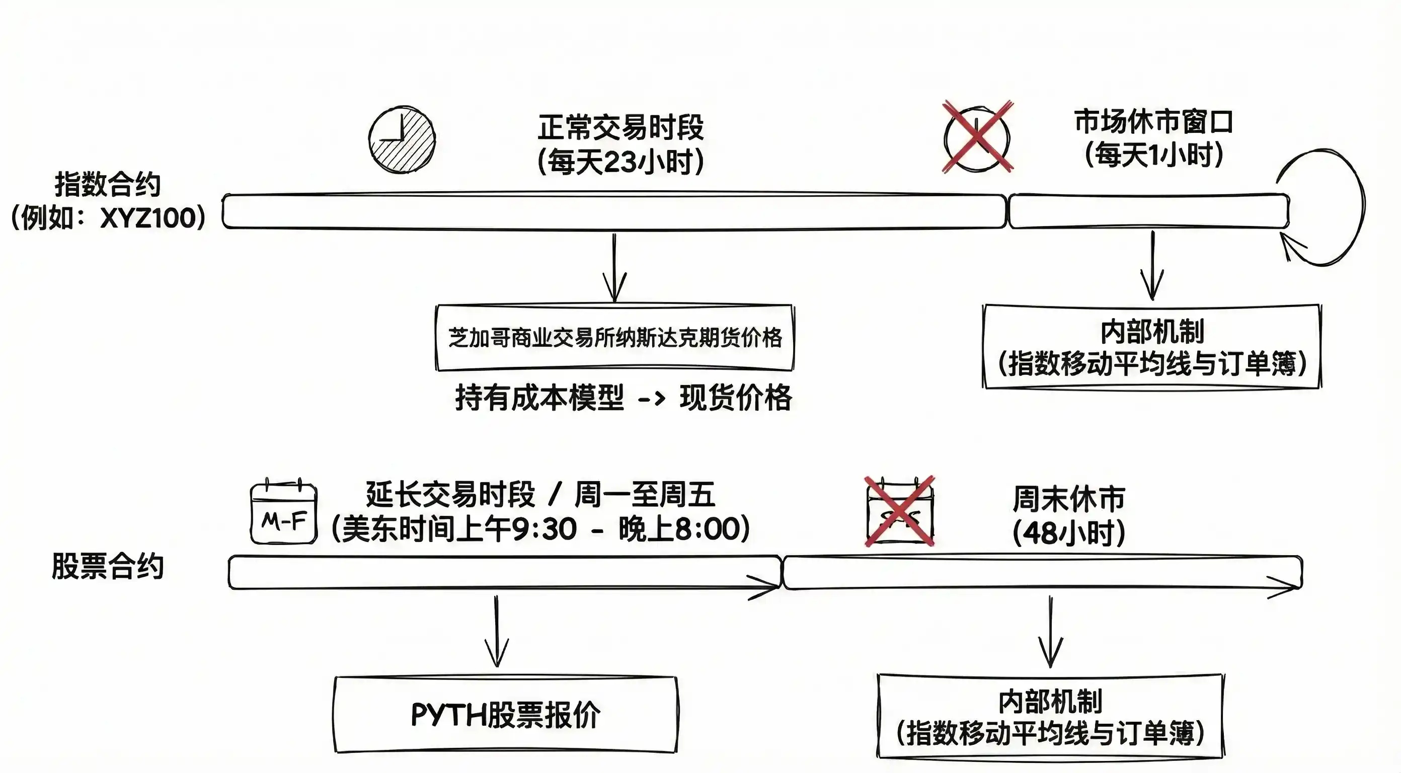 指数产品(比如跟踪纳指的XYZ100)并不直接依赖美股的现货,而是使用CME的NQ期货——这类期货每天有23小时在交易,因此价格来源更连续。trade.xyz会用一个成本持有模型,把期货价格反推成「对应的现货指数价」,让指数合约几乎可以全天保持价格更新。