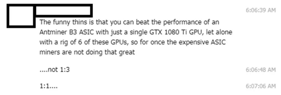 (图)B3矿机彻底失败:单个GTX1080 Ti GPU就可以轻松击败B3矿机的性能,更不用说装有6个此型号GPU的矿机。