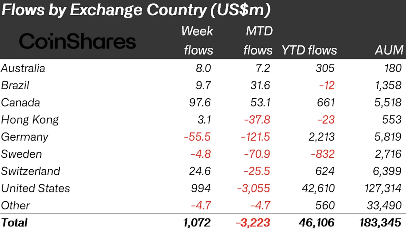 美国在周度流入数据中占据主导地位,尽管假期交易量维持低位,仍实现9.94亿美元资金流入。其他地区也贡献显著:加拿大录得9760万美元,瑞士流入2360万美元。