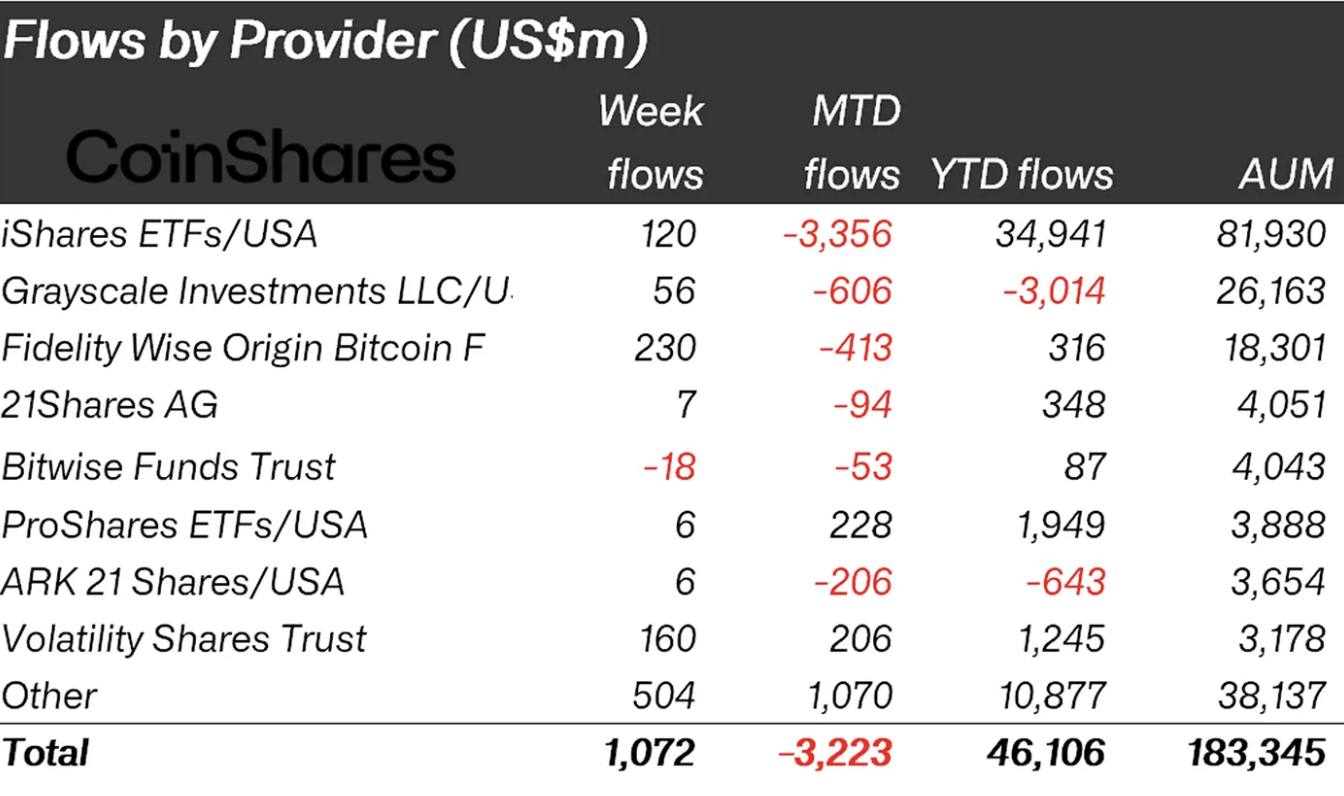 在ETP发行商中,iShares(贝莱德)以1.2亿美元流入领跑,尽管其本月净流出仍处于高位。富达的Wise Origin比特币基金以2.3亿美元紧随其后,巩固了其作为近期最具韧性发行商之一的地位。
