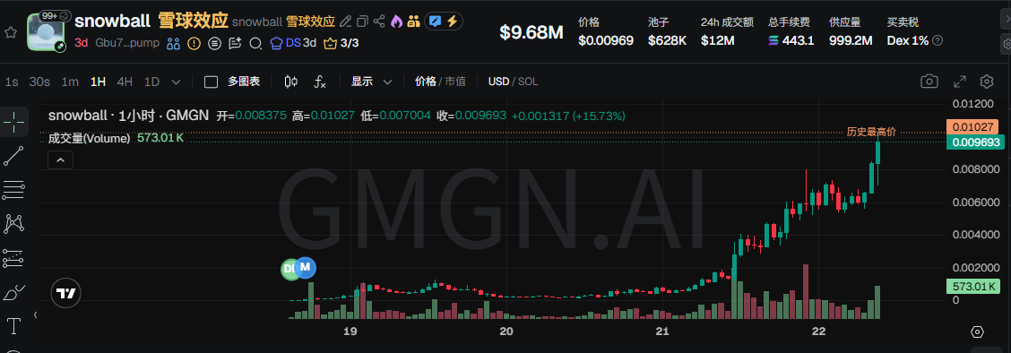 Snowball在12月18日发射,到现在四天。市值从零冲到1000万美元,24小时成交额超过1100万。