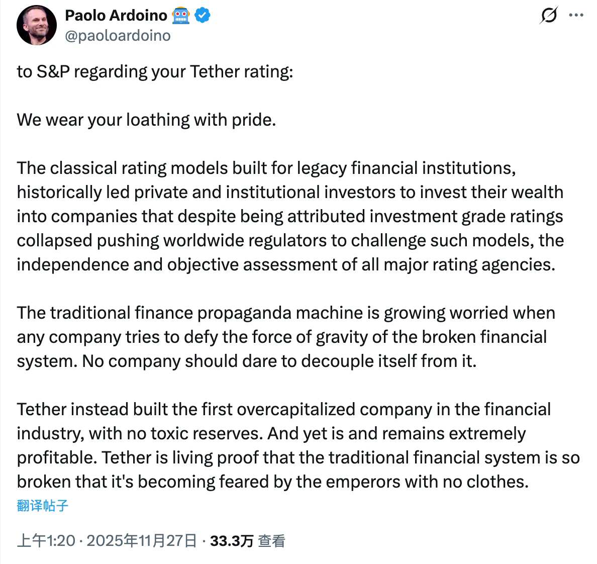 在标普给出对Tether(USDT)评级调整结果后,Tether CEO Paolo Ardoino于X平台发文强势回应道:“我们以你们的憎恨为荣。”