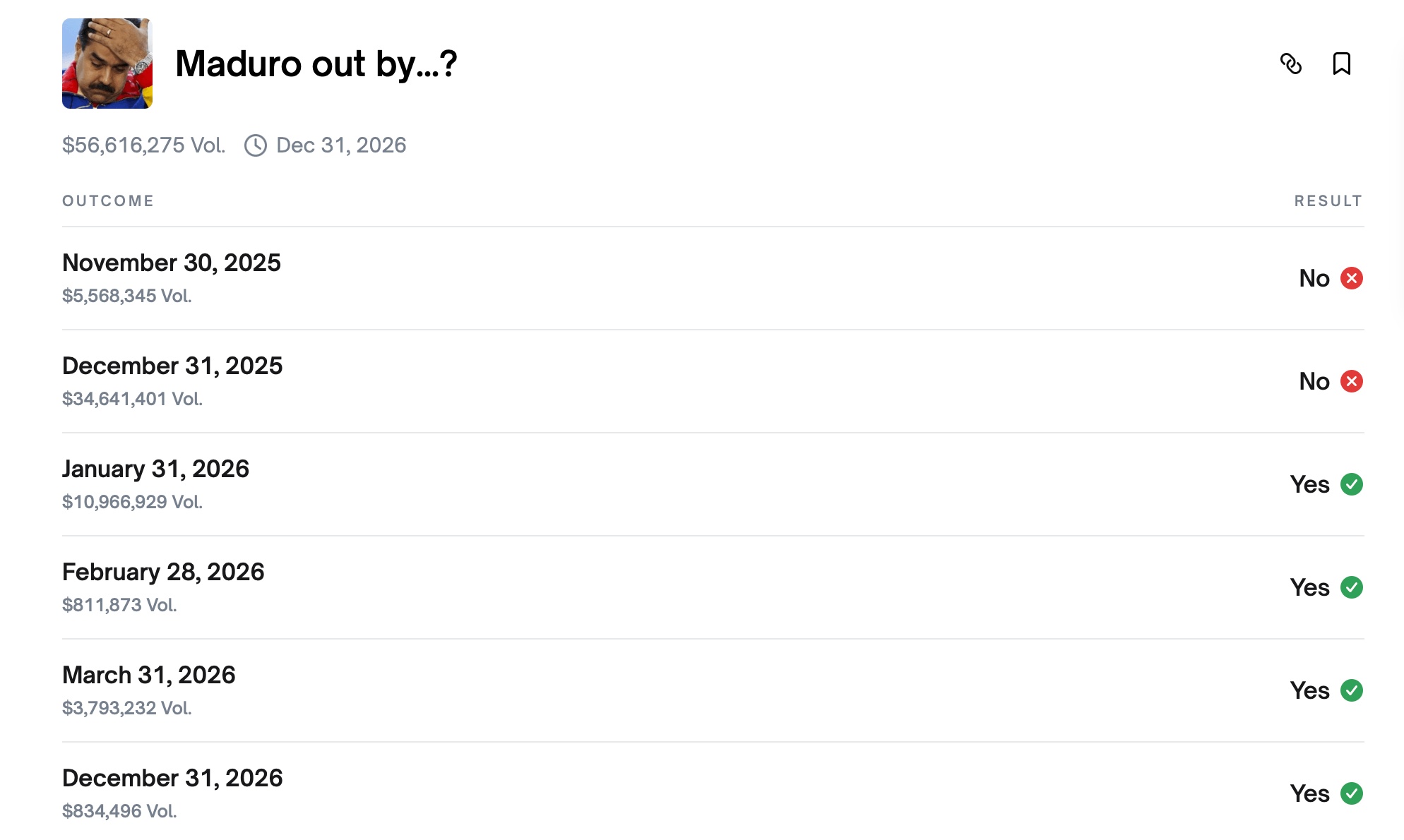 这一事件也给预测市场带来了震动,尤其是在Polymarket,那里交易者一直在押注马杜罗是否以及何时会下台。Bitcoin.com新闻于2025年12月13日报道了这项特定的赌注,当时马杜罗下台的可能性开始上升。一项与他2026年1月31日前下台相关的旗舰合约在他的被捕得到确认后于1月3日解除了为“是”。